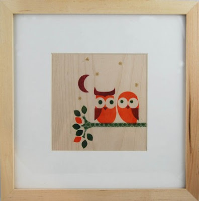 Lorena uses maple plywood as a canvas for her artwork, incorporating a natural element with the beauty of the wood grain, to interact with re-used papers. I have one of her pieces I picked up at her Doe solo show, and it's one of my favorites. For more information about Lorena's artwork you can check out her website as well as her illustration gallery.
